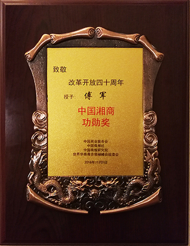 在隆重的頒獎晚會上,新華聯集團董事局主席兼總裁傅軍因為中國湘商事業的發展做出突出貢獻,被授予“中國湘商功勛獎”。同時獲此殊榮的還有大漢控股集團董事長、總裁傅勝龍。